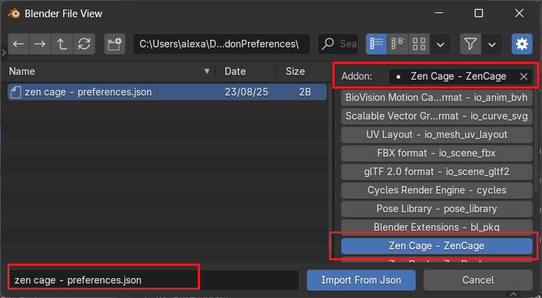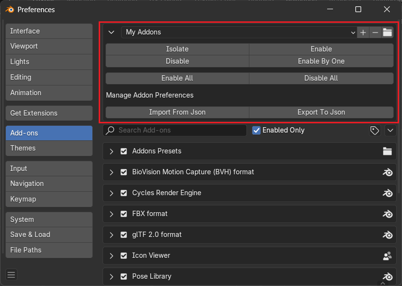 This is a convenient feature for saving and loading any addon preferences using JSON files. This allows users to back up their settings, share configurations, or transfer preferences between Blender installations.