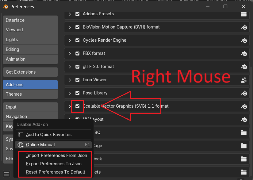 When the user right-clicks on the Enable Addon checkbox in the Add-ons section of Blender Preferences, a popup menu appears with the following options: